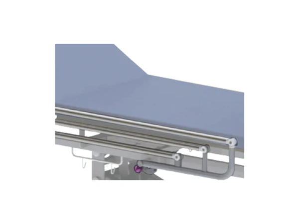 The backrest and tilt control are manually operated with gas assist. It also includes integrated fold down 3/4 length stainless steel side rails. The undercarriage has an ABS cover which has integrated storage space. It is also suitable for use during x-rays and includes an x-ray cassette holder. The Tente 8” Castors are central locking with pedals at the head and foot end.